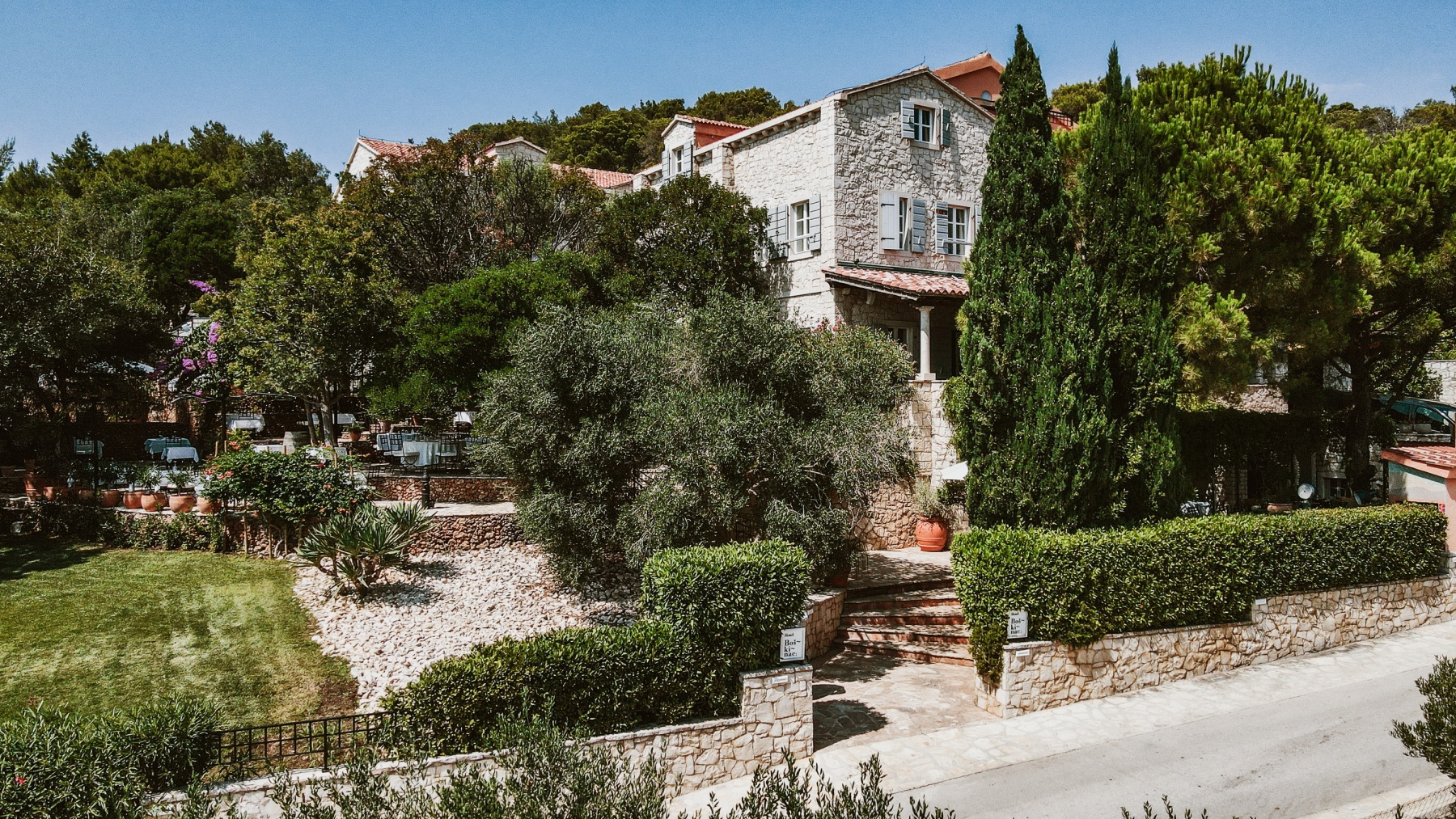 Boškinac boutique hotel is situated on the island of Pag, between Novalja and Stara Novalja, on a hill amidst the dense pine woods, at the edges of the vineyards and olive groves. Considering that it stands at the top of the Novaljsko Polje field, at the entrance to Zaglava – a traditional karst terrain for the grazing of sheep – the views from this lovely stone hotel and its terraces and gardens stretch out of the calmer and more relaxed side of Pag – a quiet and fragrant valley.